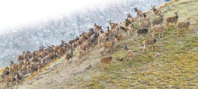 国家一级野生保护动物白唇鹿群现身祁连山